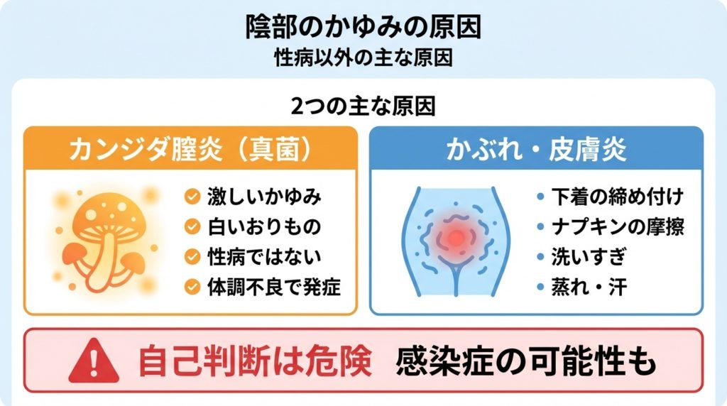 陰部や性器にかゆみが生じる原因はさまざまです。陰部のかゆみ=性病と決めつけず、性病以外の主な原因についても押さえておきましょう。