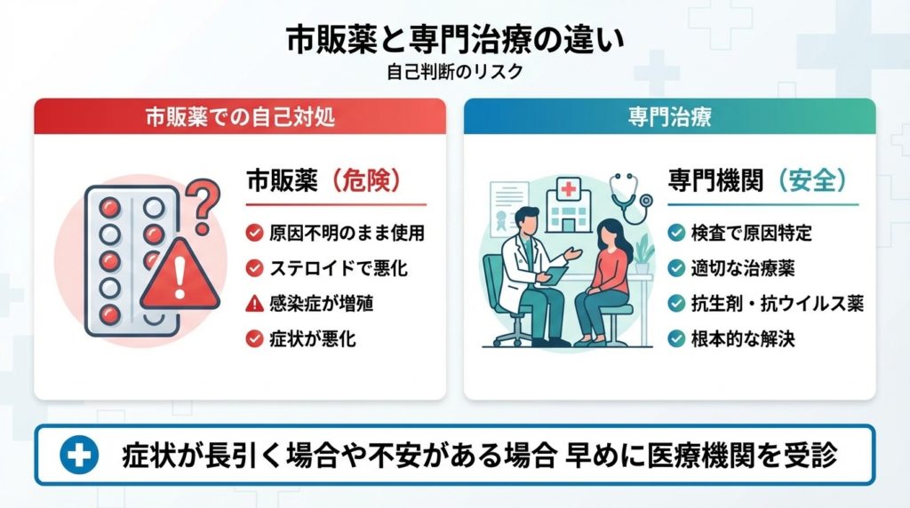 陰部のかゆみはデリケートな悩みのため、つい人に相談できず市販の塗り薬などで済ませたくなるかもしれません。しかし、自己判断での治療にはリスクがあります。