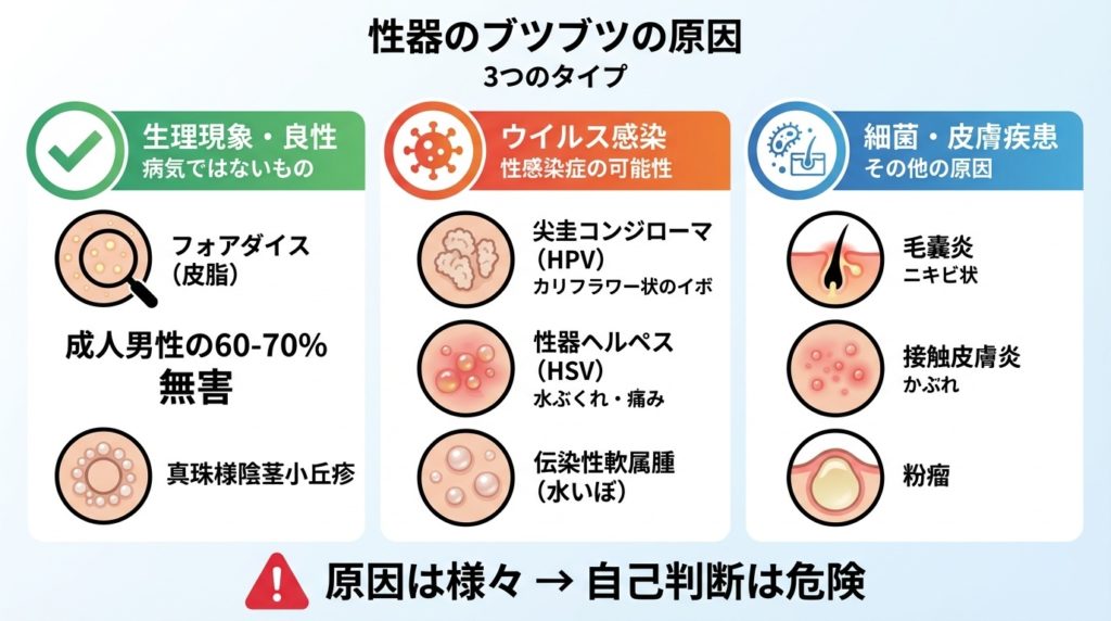 確かに性感染症(いわゆる性病)が原因の場合もありますが、性器のブツブツが必ずしも性病とは限りません。皮膚の炎症や良性のできものなど、性病以外の原因で生じることも多いのです。