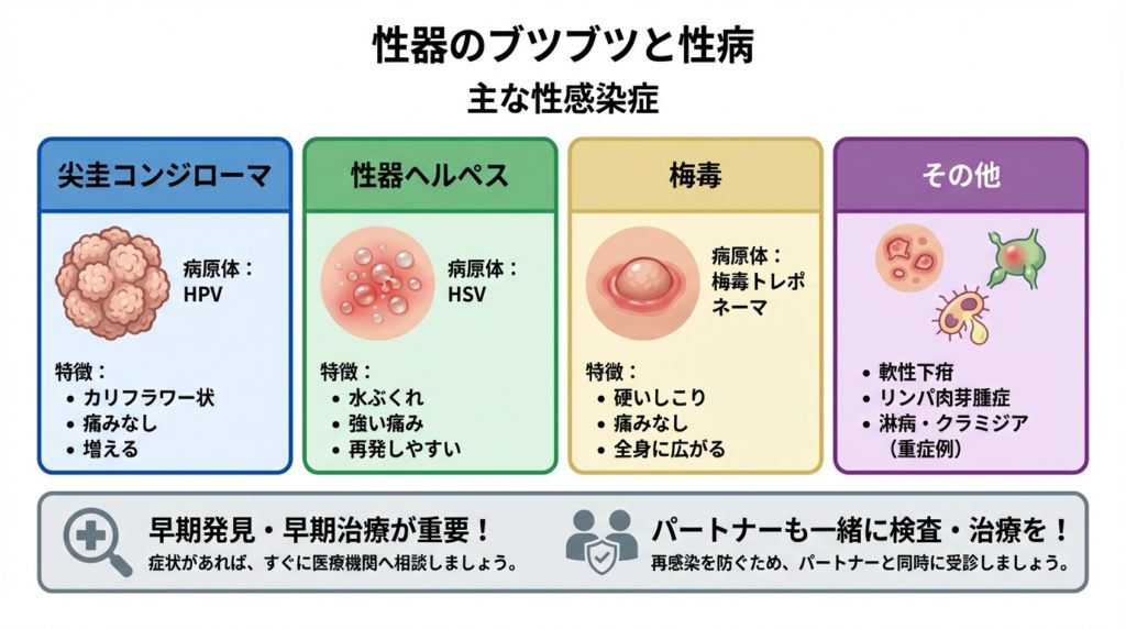 ここでは性器にブツブツ・できものを生じうる主な性感染症とその特徴を解説します。