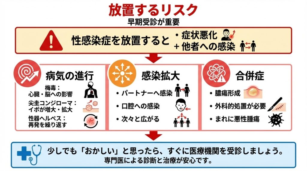 性器にできたブツブツ・できものを「痛くないし、そのうち治るだろう」と放置するのは非常に危険です。最大のリスクは、それが性感染症だった場合に治療が遅れることです。性病は適切な治療をせずに放置すると症状が悪化し、深刻な合併症を招いたり他の人に感染させたりする恐れがあります。