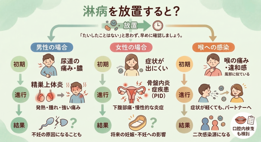 淋病において「症状がないこと」は、「感染していないこと」を意味しません。特に女性・喉への感染では無症状の割合が高く、自覚のないまま長期間感染が続くケースが報告されています。この状態を放置することで起こりうる問題は2つです。