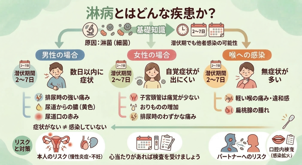 淋病は性感染症のなかでも感染力が強く、症状が出やすい疾患ですが、女性の場合は自覚症状がほとんどないケースも珍しくありません。また、喉への感染(咽頭淋菌)は多くの方が見落としがちなポイントです。